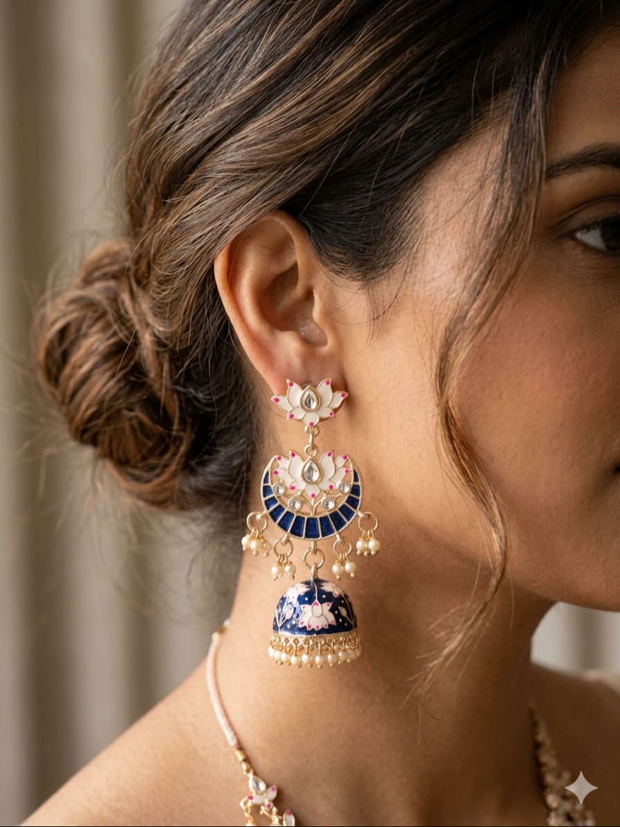 Blue Pink Meenakari Kundan Pearls Jhumki Earrings Set