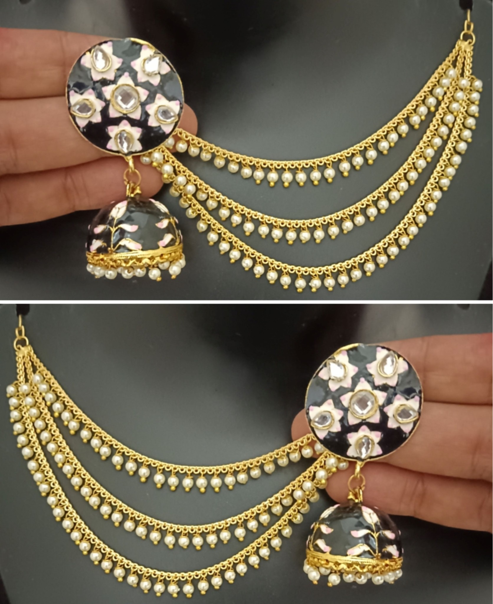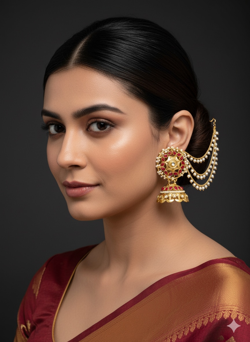 Beautiful Kundan Pearls Jhumka Earrings with Kaan Chain