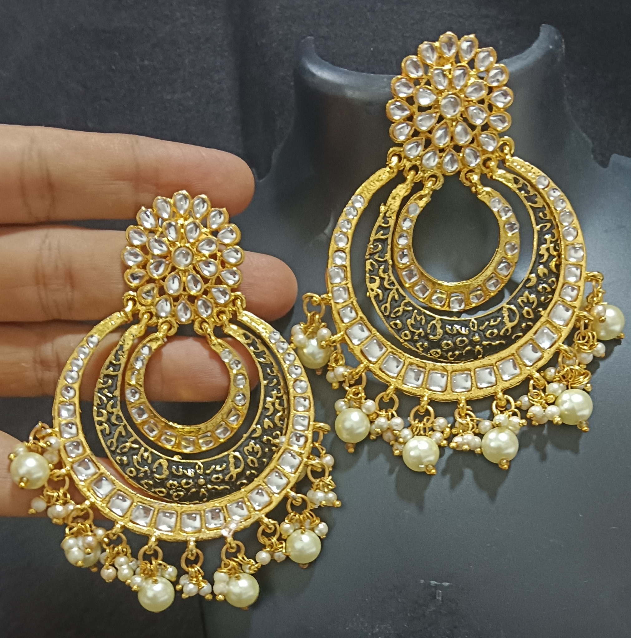 Black Meenakari Kundan Pearls Chandbali Beautiful Earrings Set