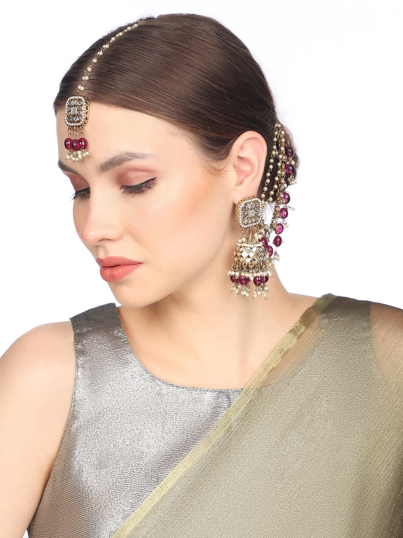 Beautiful Jhumka Earrings with Kaan Chain and Tikka Set