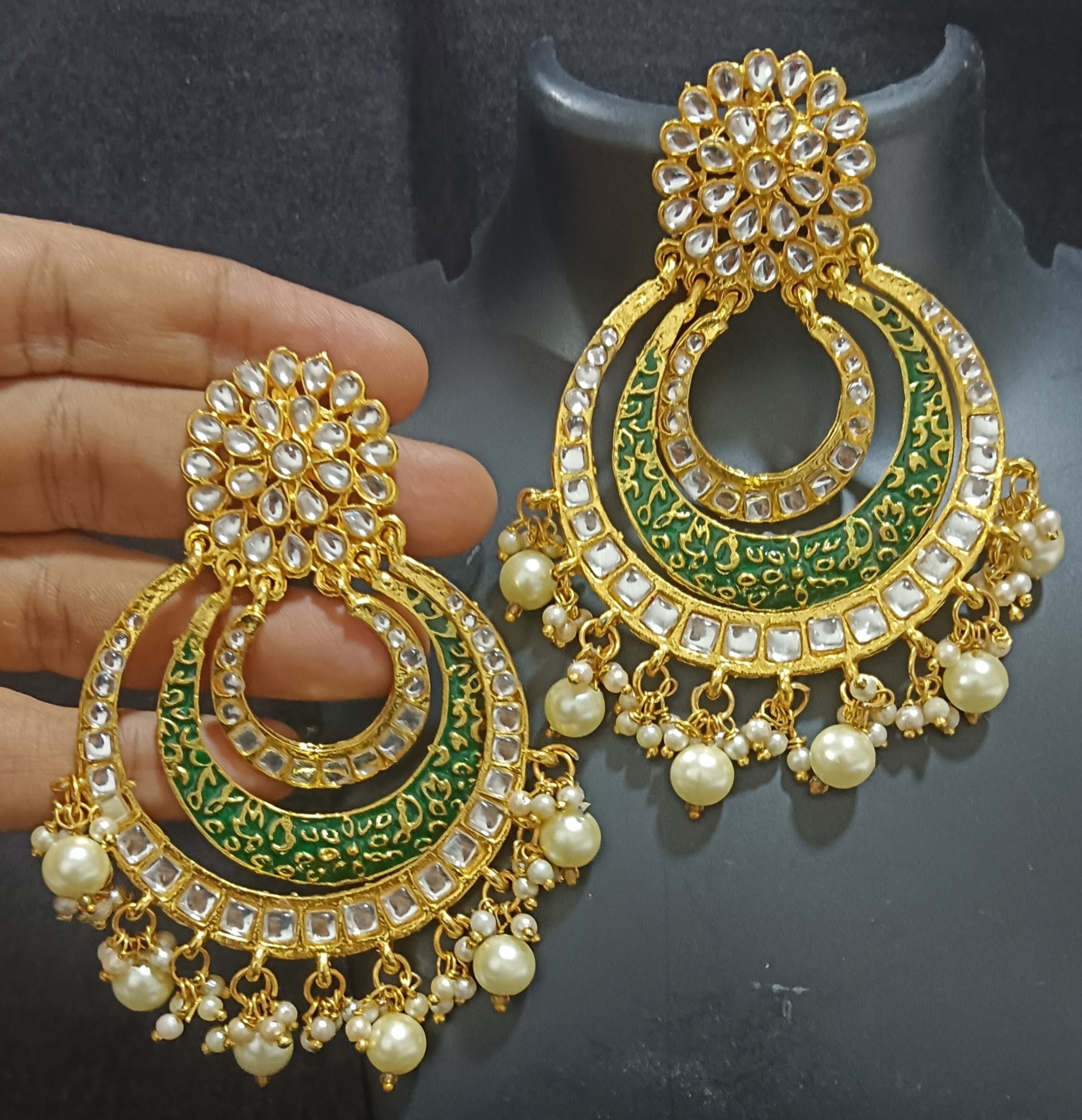 Green Meenakari Kundan Pearls Chandbali Beautiful Earrings Set