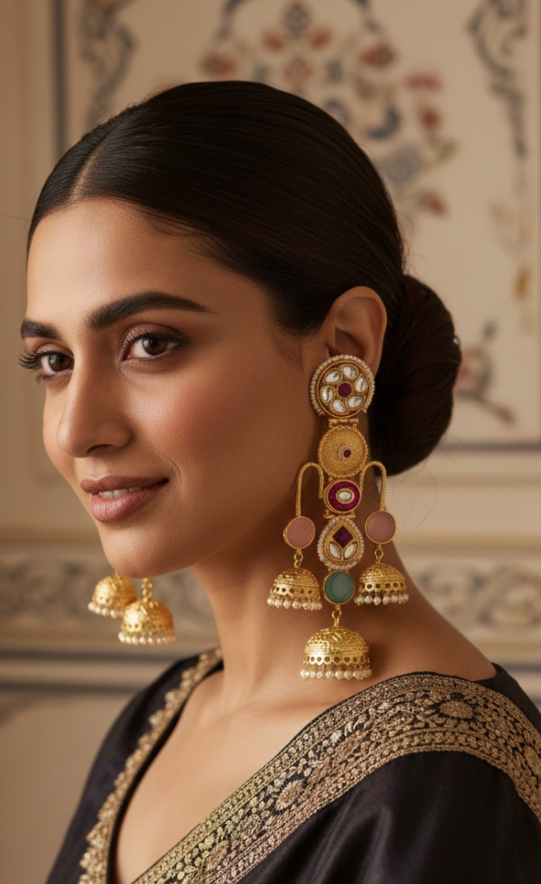 Celebrity Inspired Original Quality Kundan Laheriya Pearls Jhumki Earrings Set