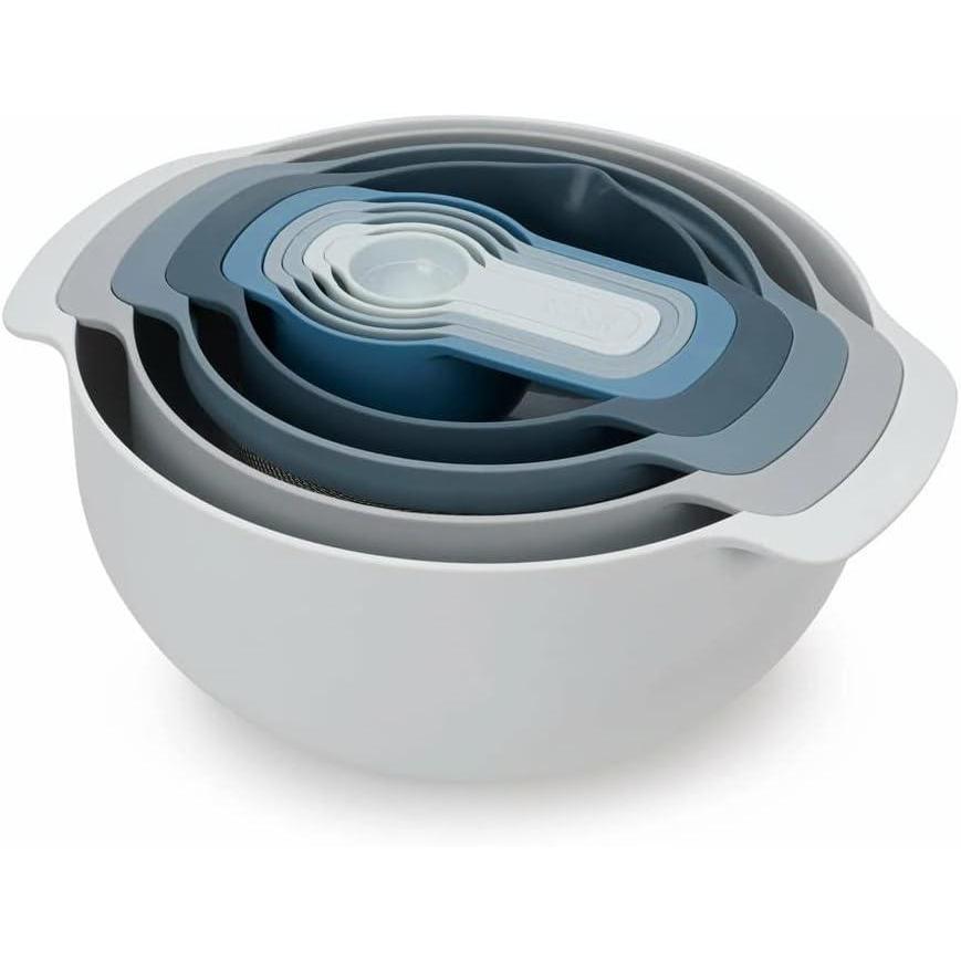 Joseph Joseph Nest 9 Plus, 9 Piece Compact Food Preparation Set with Mixing Bowls, Measuring Cups, Sieve and Colander, Stainless Steel(Blue)