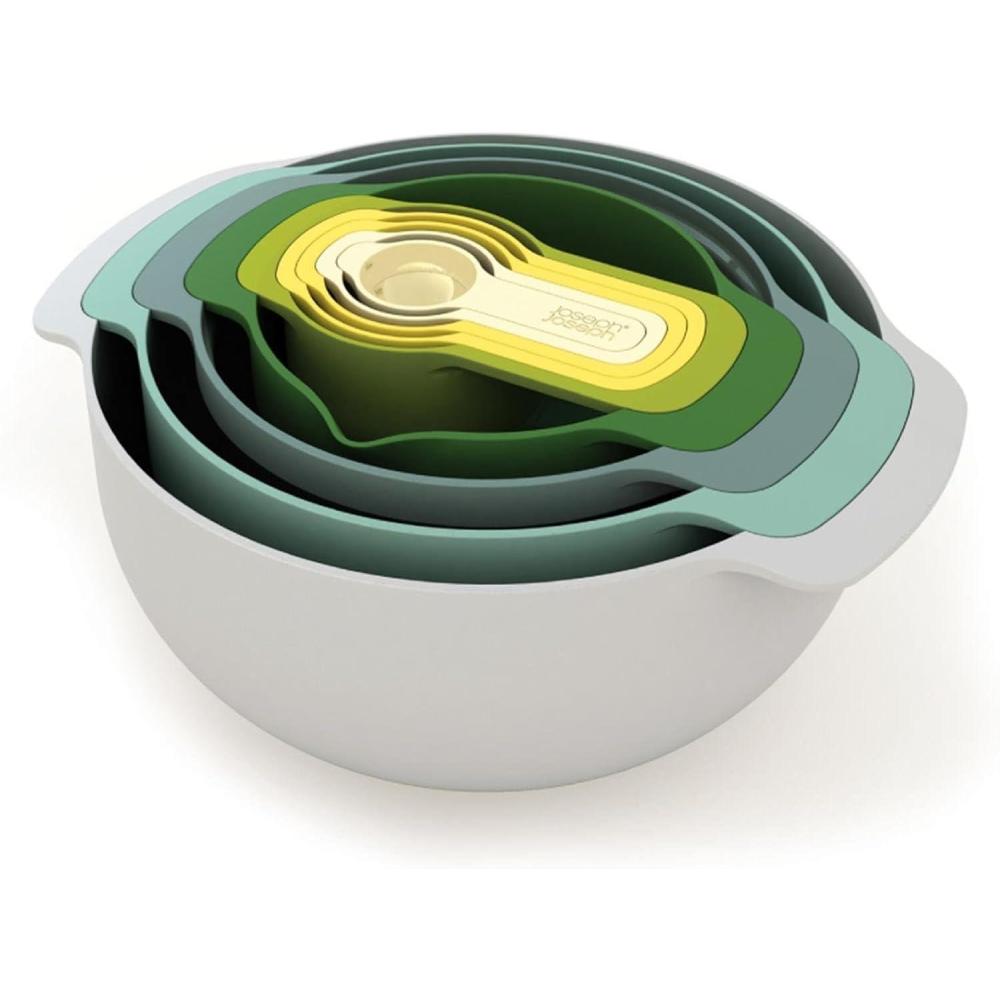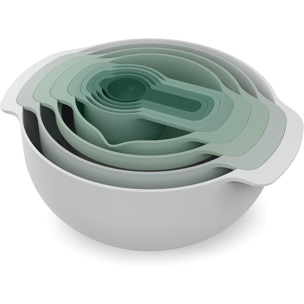 Joseph Joseph Nest 9 Plus, 9 Piece Compact Food Preparation Set with Mixing Bowls, Measuring Cups, Sieve and Colander, Stainless Steel(Green)