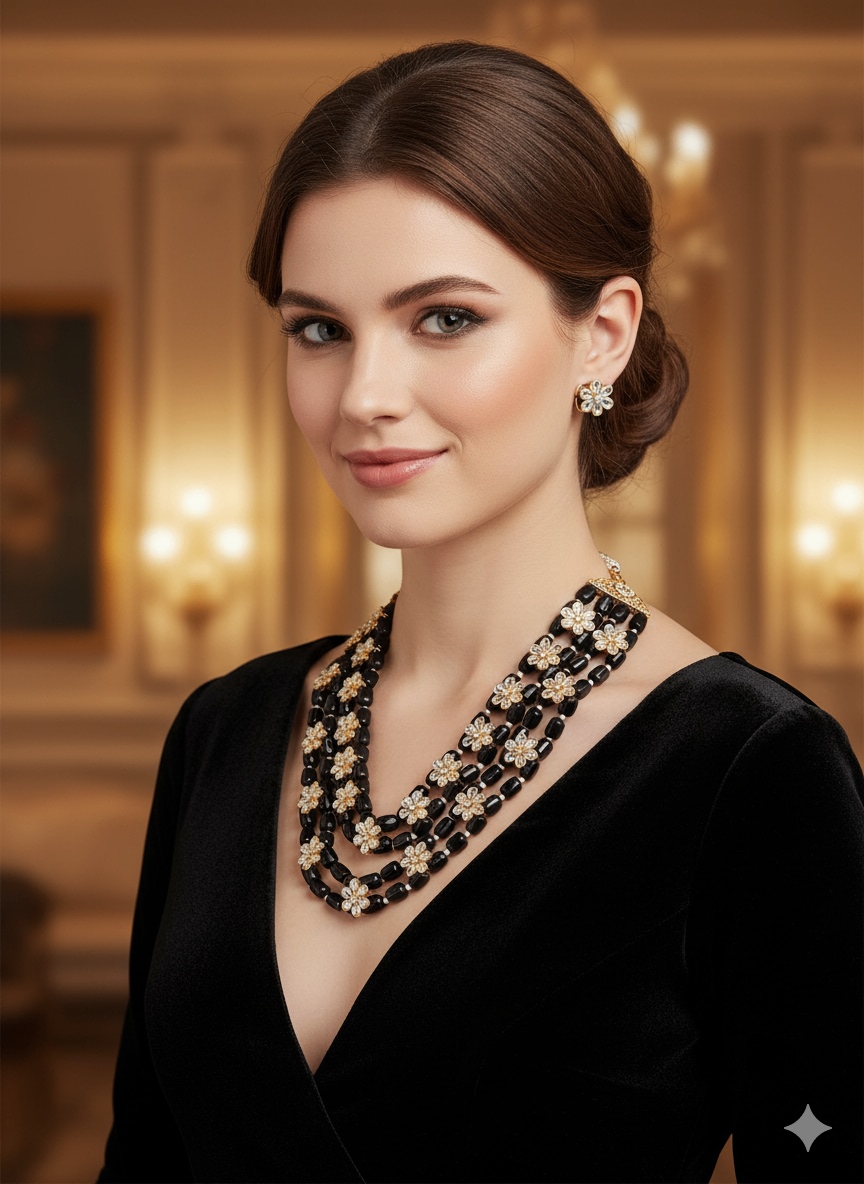 Black Pearls Kundan Beautiful Multi Strand Jewellery Set